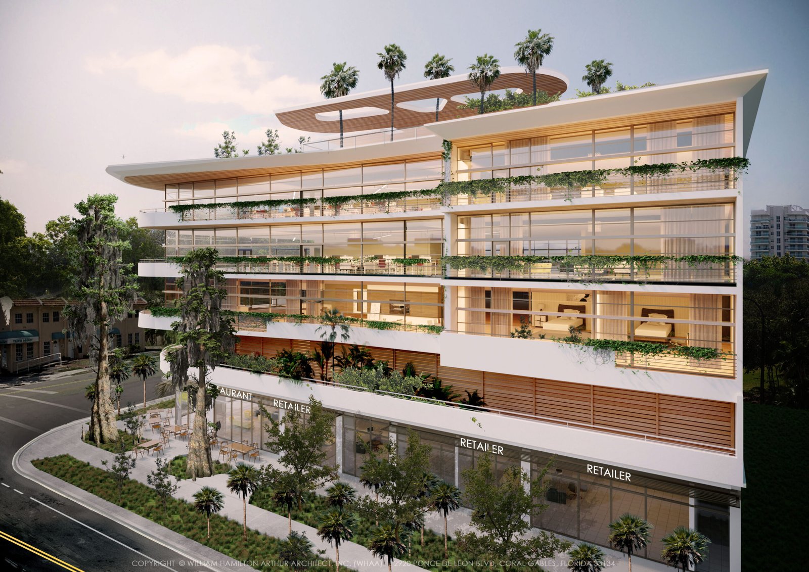 The project includes planted balconies, an open-air breezeway, rooftop terrace and a subterranean parking garage with automated car elevators. The interior design reflects some of the original mid-century modern design that relate to the essence of Coconut Grove. The plan features the precedent study of Le Corbusier, who can be credited for prompting a variety of mid-century thinkers. His Dom-ino project proposed an open floor plan consisting of concrete slabs supported by a minimal number of thin, reinforced concrete columns around the edges, with a stairway providing access to each level on one side of the floor plan. The frame was to be completely independent of the floor plans of the houses thus giving freedom to design the interior configuration. The model eliminated load-bearing walls and the supporting beams for the ceiling.[1] Features have been borrowed from the world-renowned invention of the open floor plan layout. The design speaks to the open nature of conversation and engagement in an effort to energize the space.
