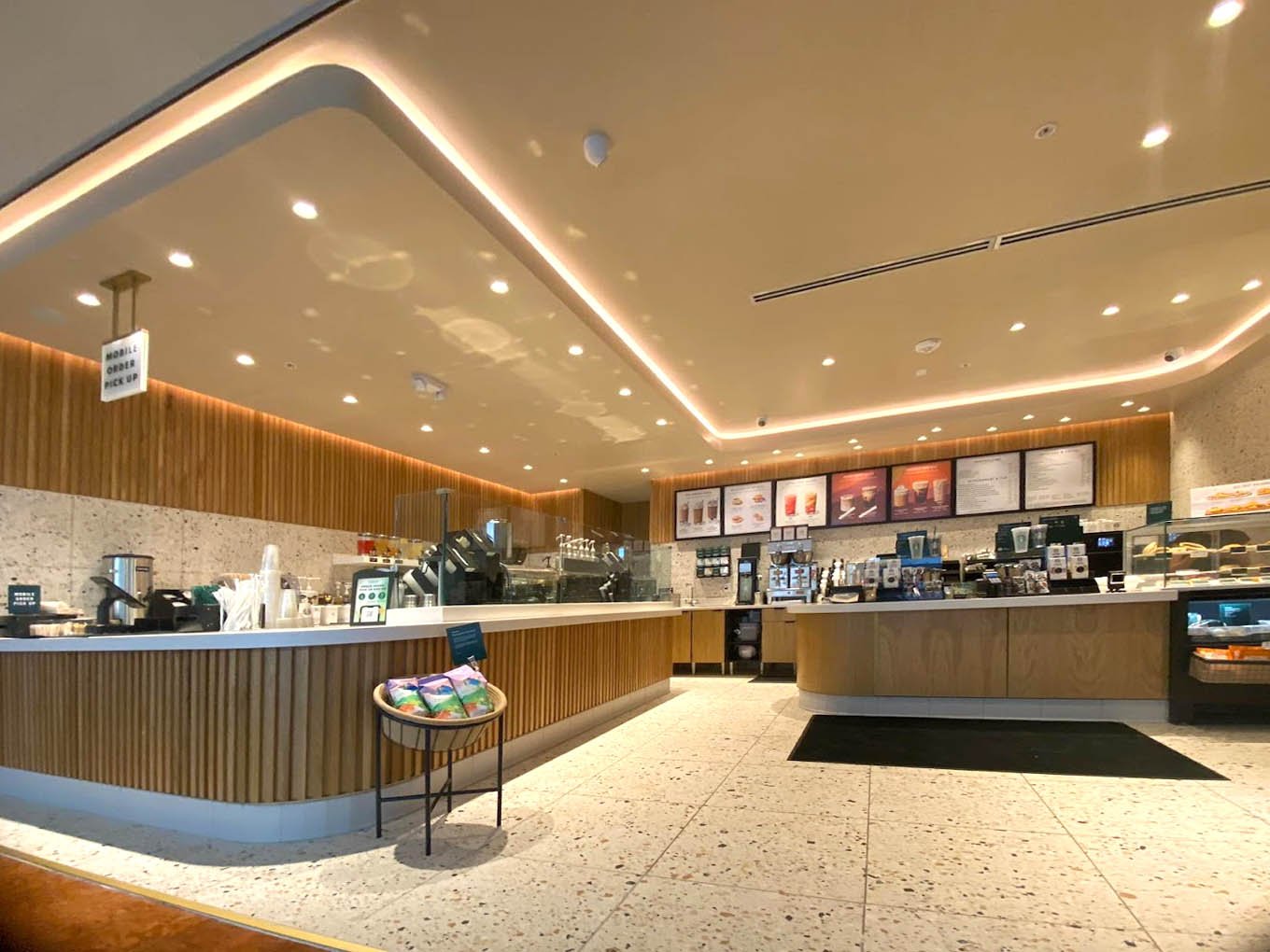 The interiors employed fluted wood millwork, pink terrazzo, and streamline-modernity ceilings formed into a massing that was informed by the function and efficiency of QSR. Interior illumination was carefully calculated to render the maximum effect of warmth and energy associated with the brand’s coffee.